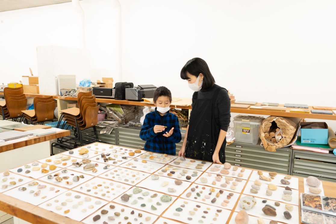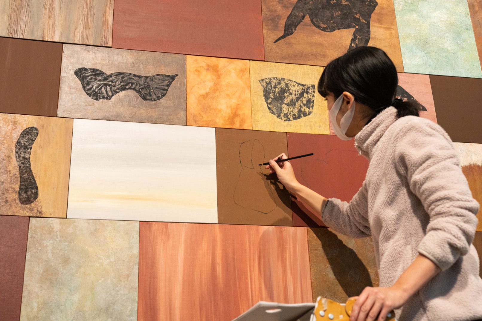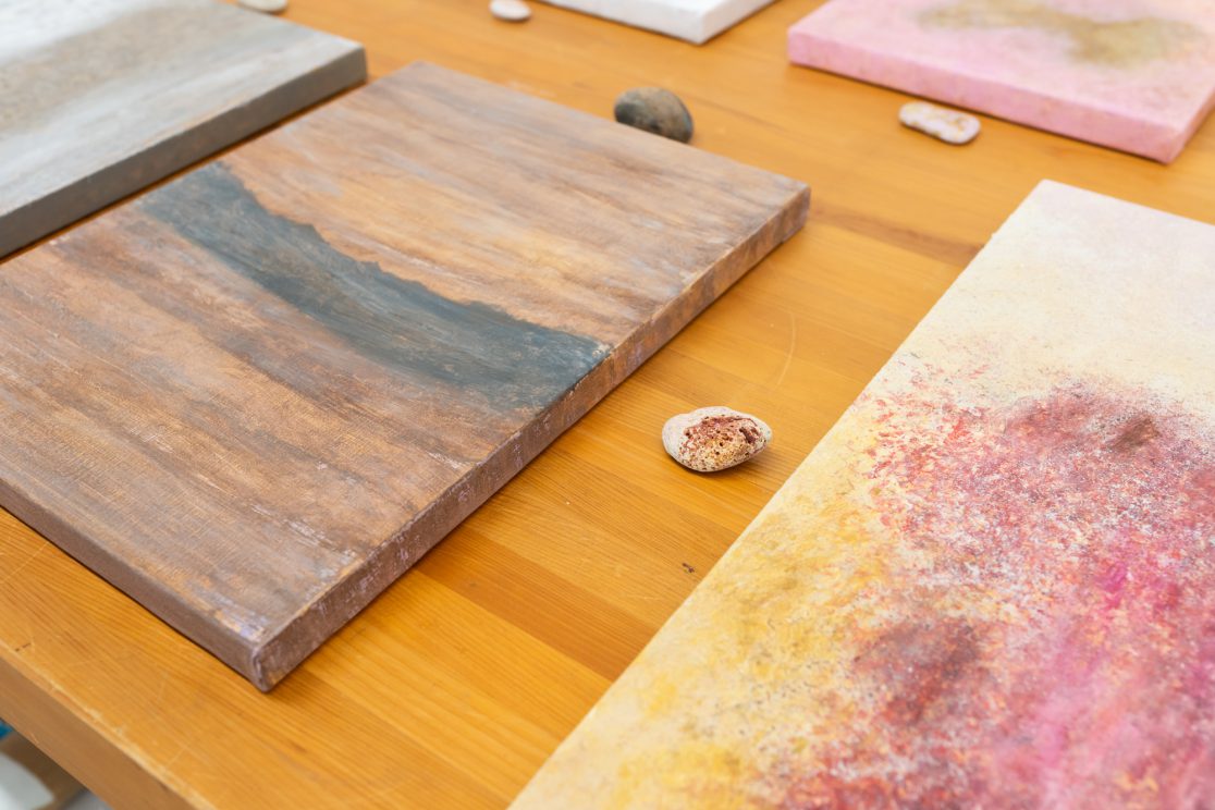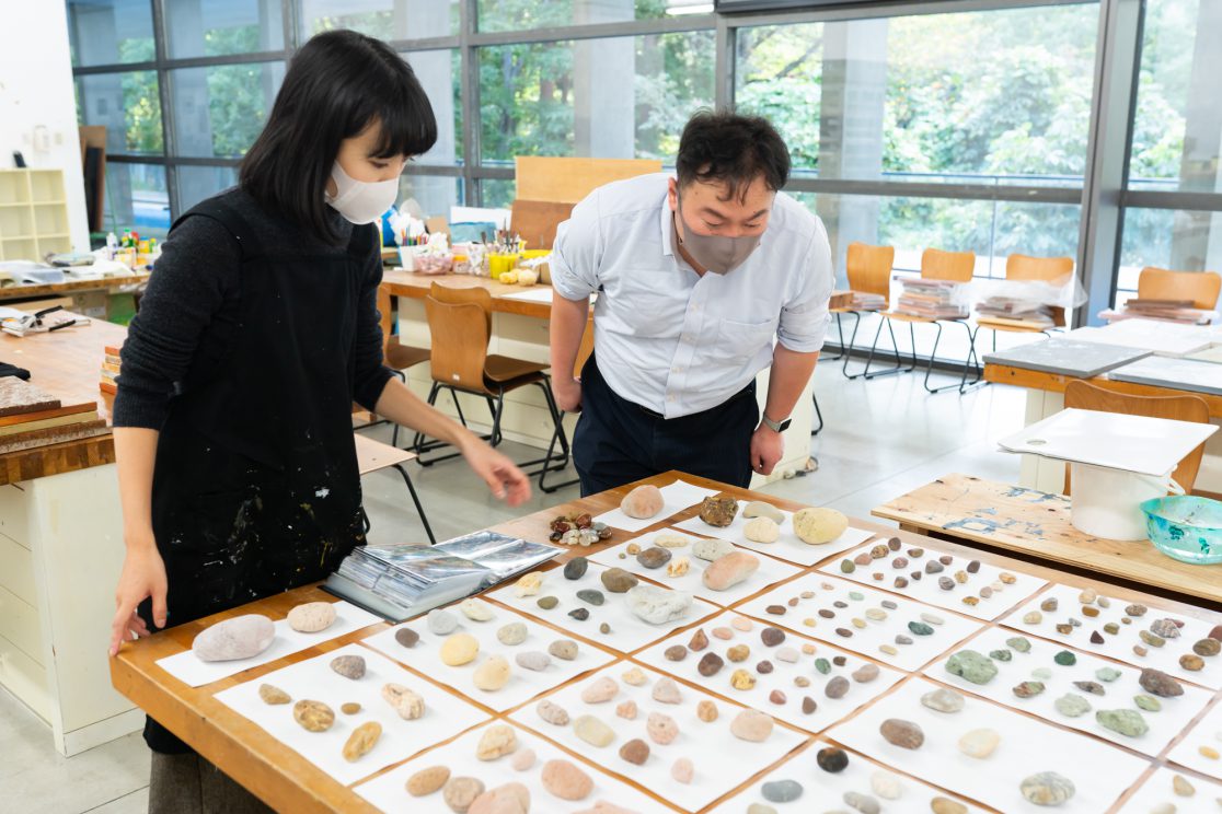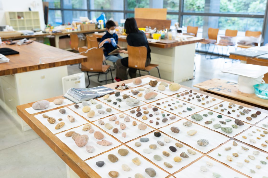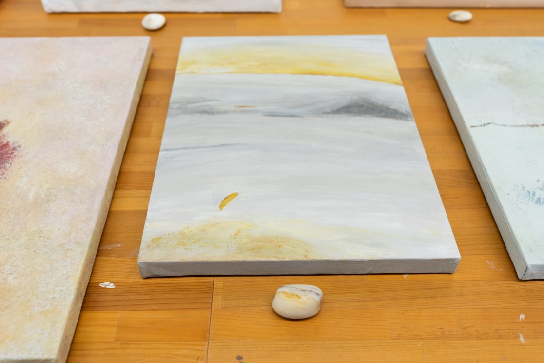 「石の肖像 -埋没する形象02-」は、青森県内で収集した石をモチーフに、約26名の青森県内に住むワークショップ参加者と絵画の下地を協働制作した。