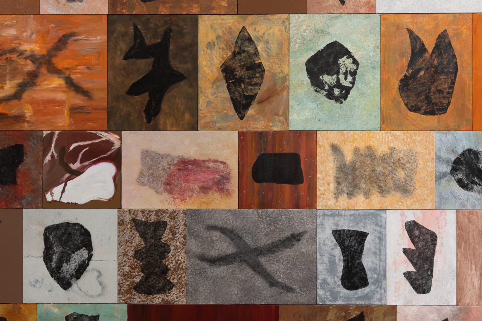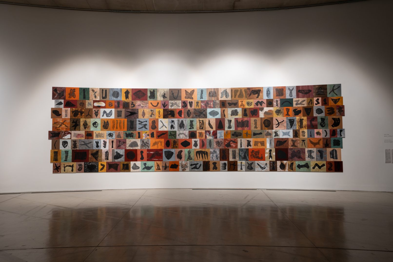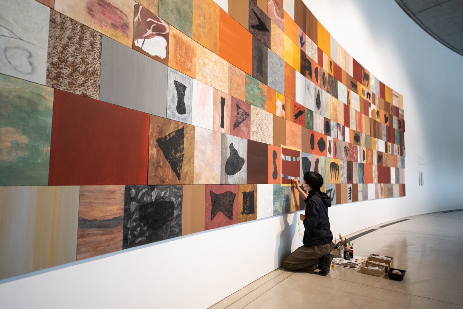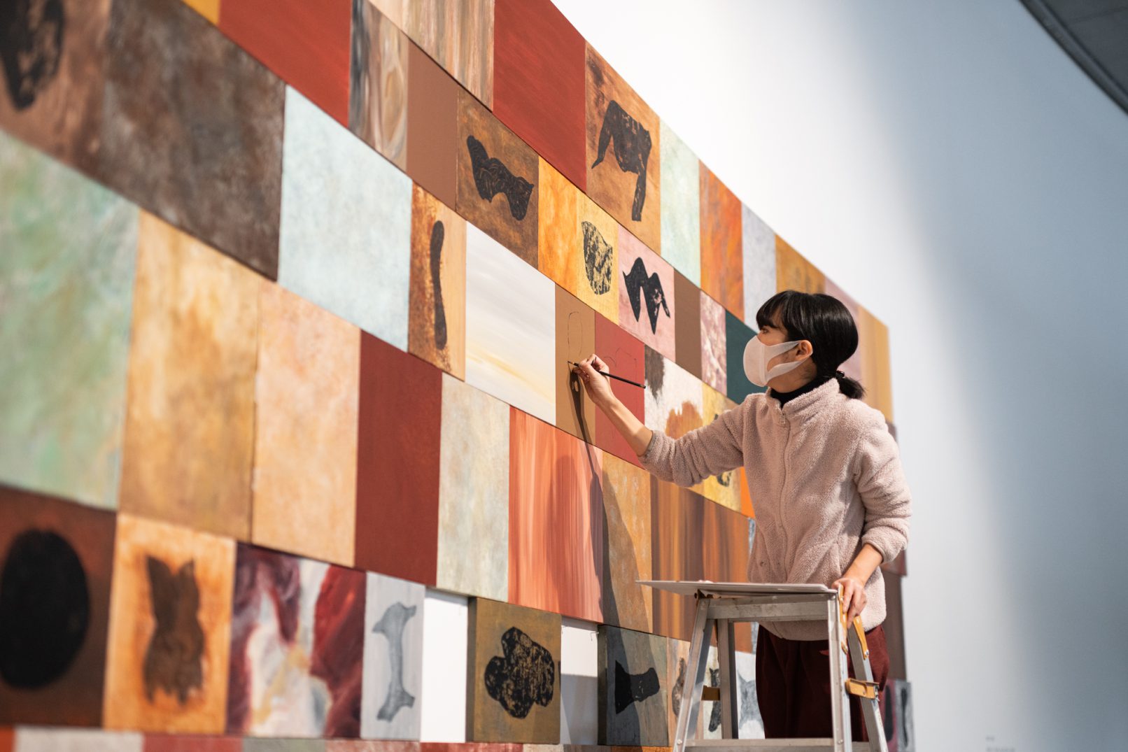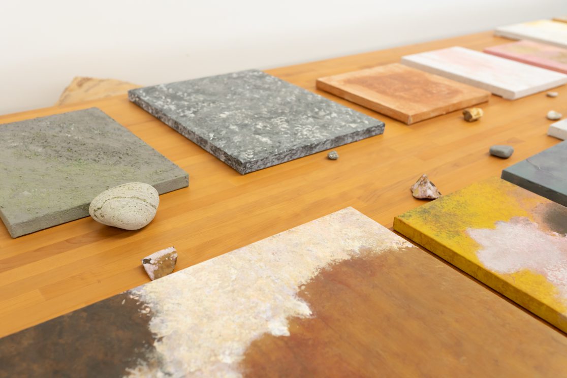 「石の肖像 -埋没する形象02-」は、青森県内で収集した石をモチーフに、約26名の青森県内に住むワークショップ参加者と絵画の下地を協働制作した。