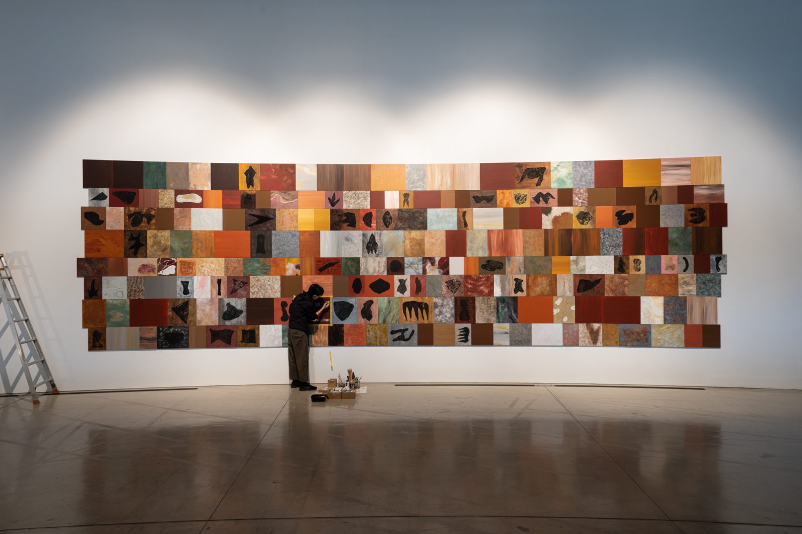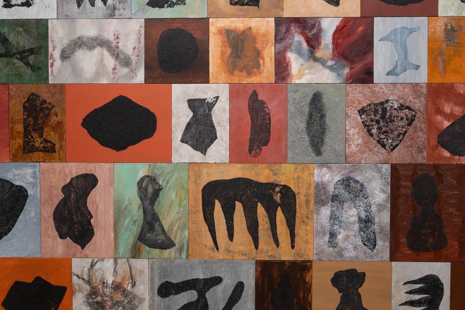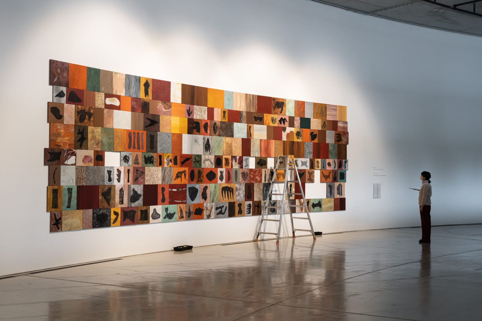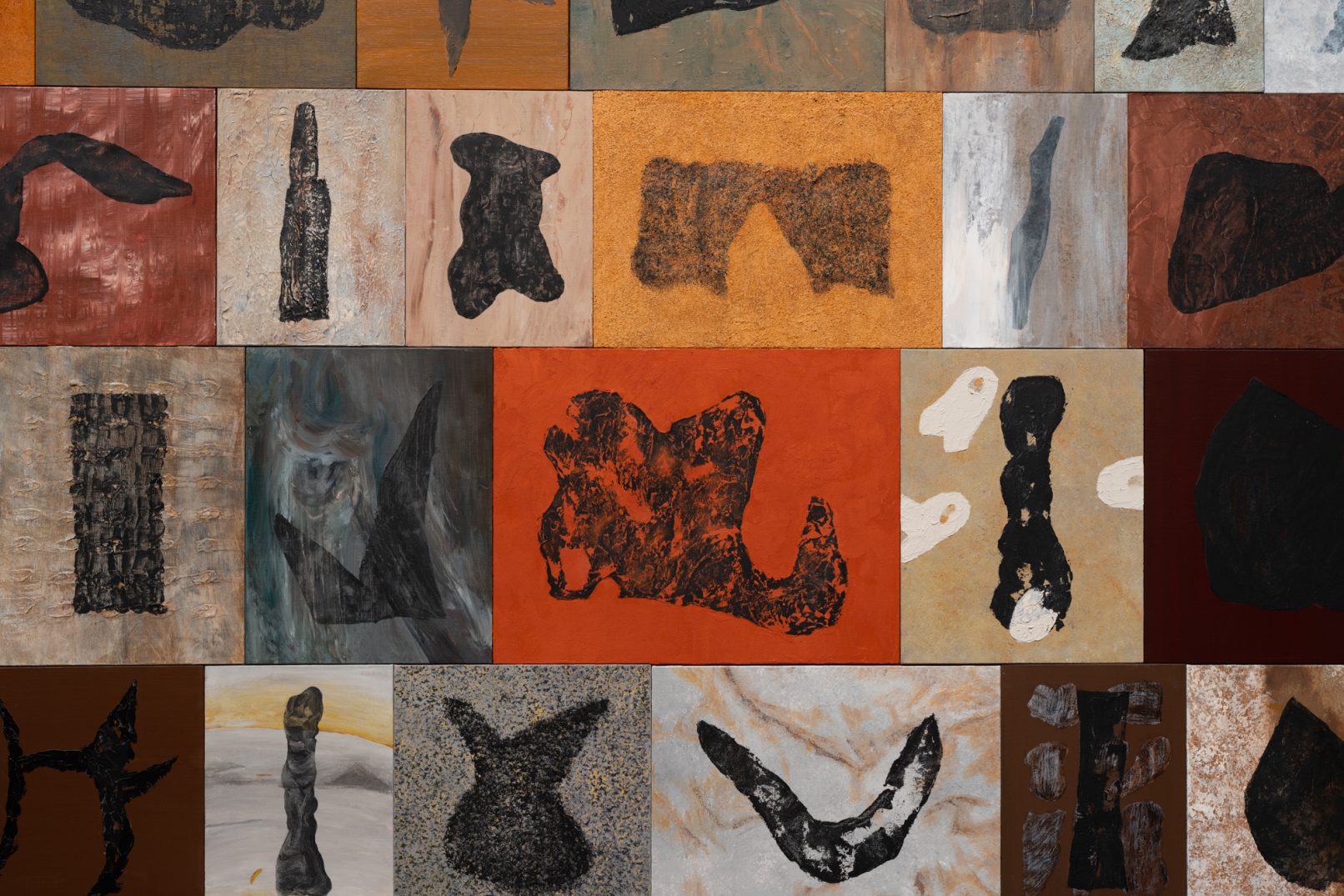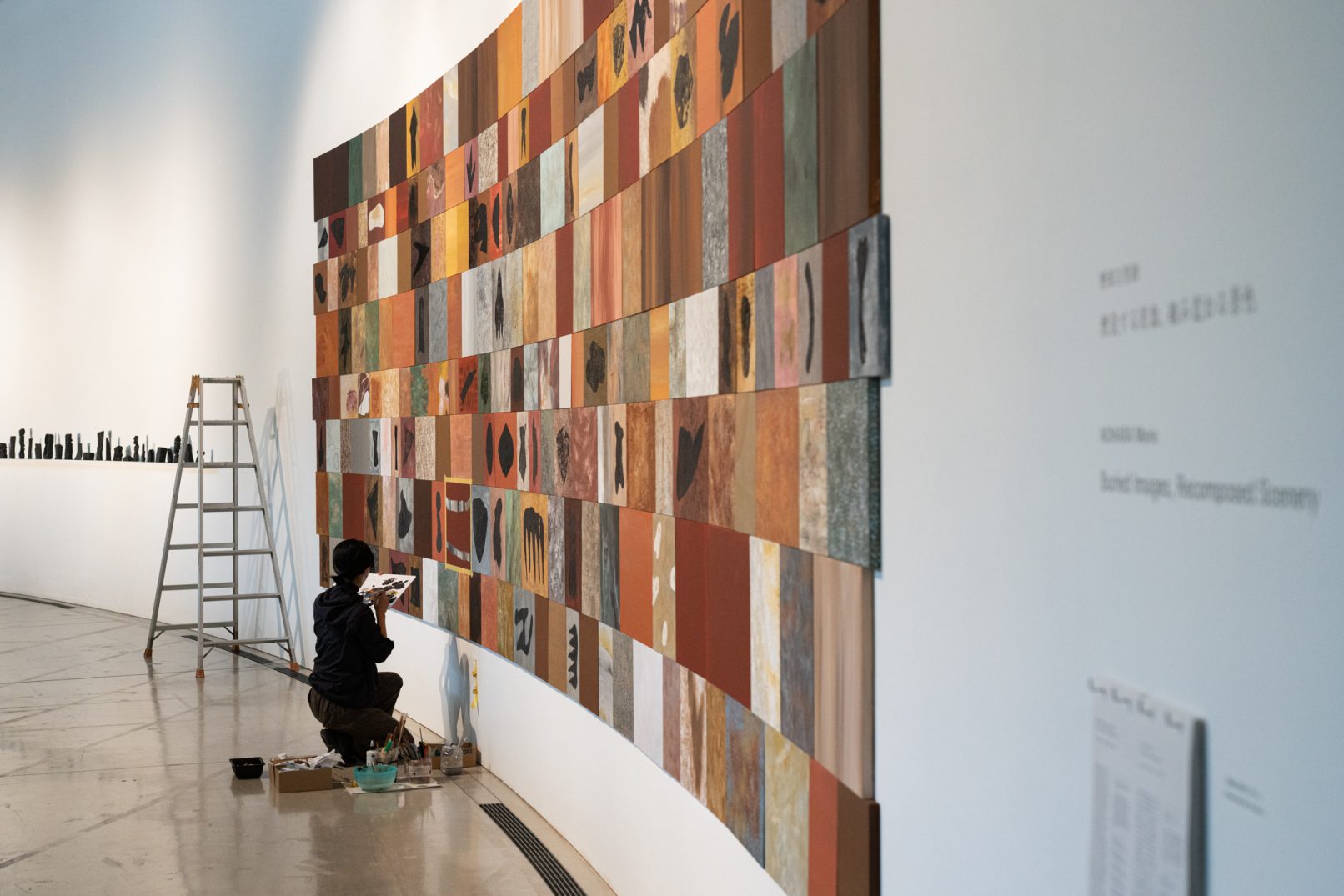「石の肖像 -埋没する形象02-」は、青森県内で収集した石をモチーフに、約26名の青森県内に住むワークショップ参加者と絵画の下地を協働制作した。