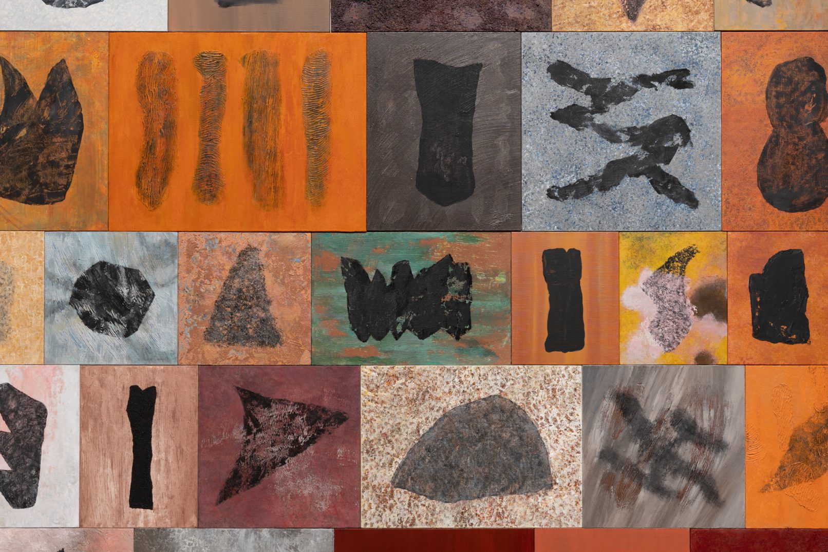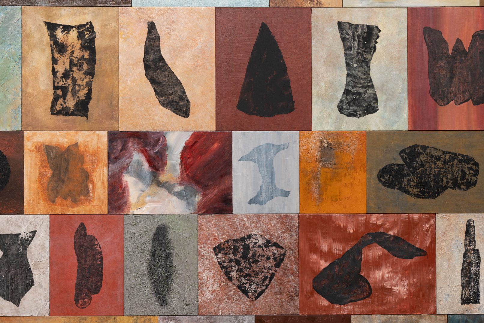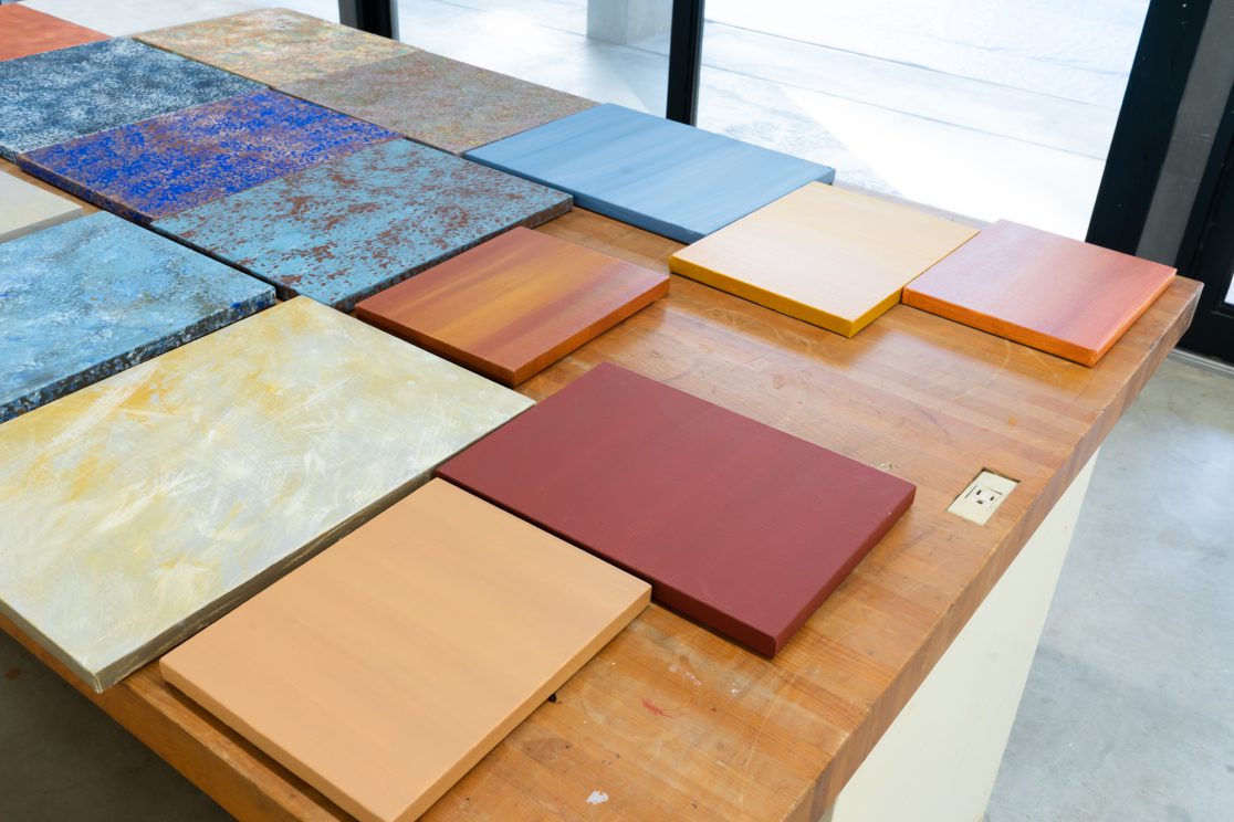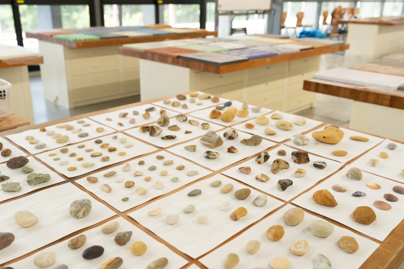 「石の肖像 -埋没する形象02-」は、青森県内で収集した石をモチーフに、約26名の青森県内に住むワークショップ参加者と絵画の下地を協働制作した。