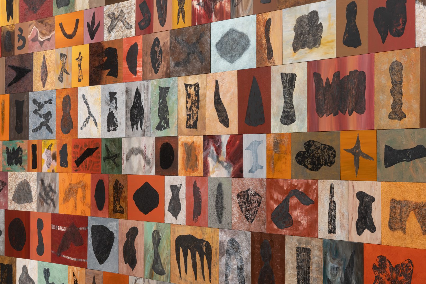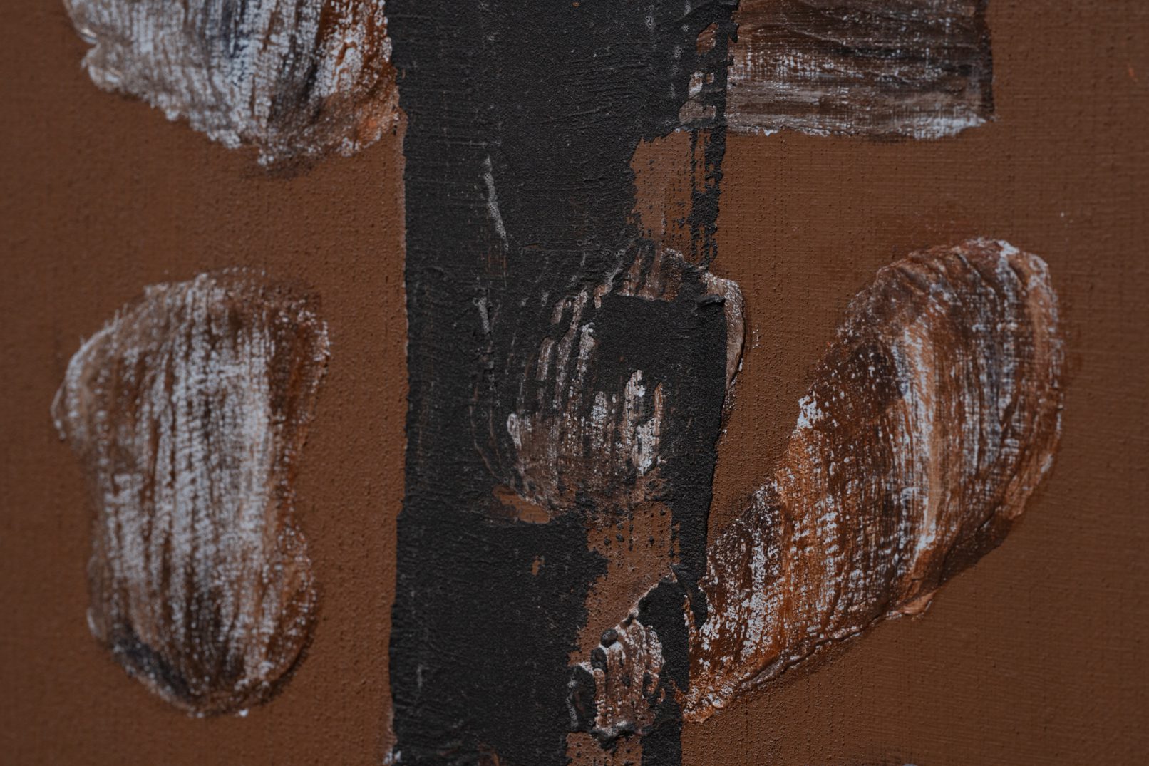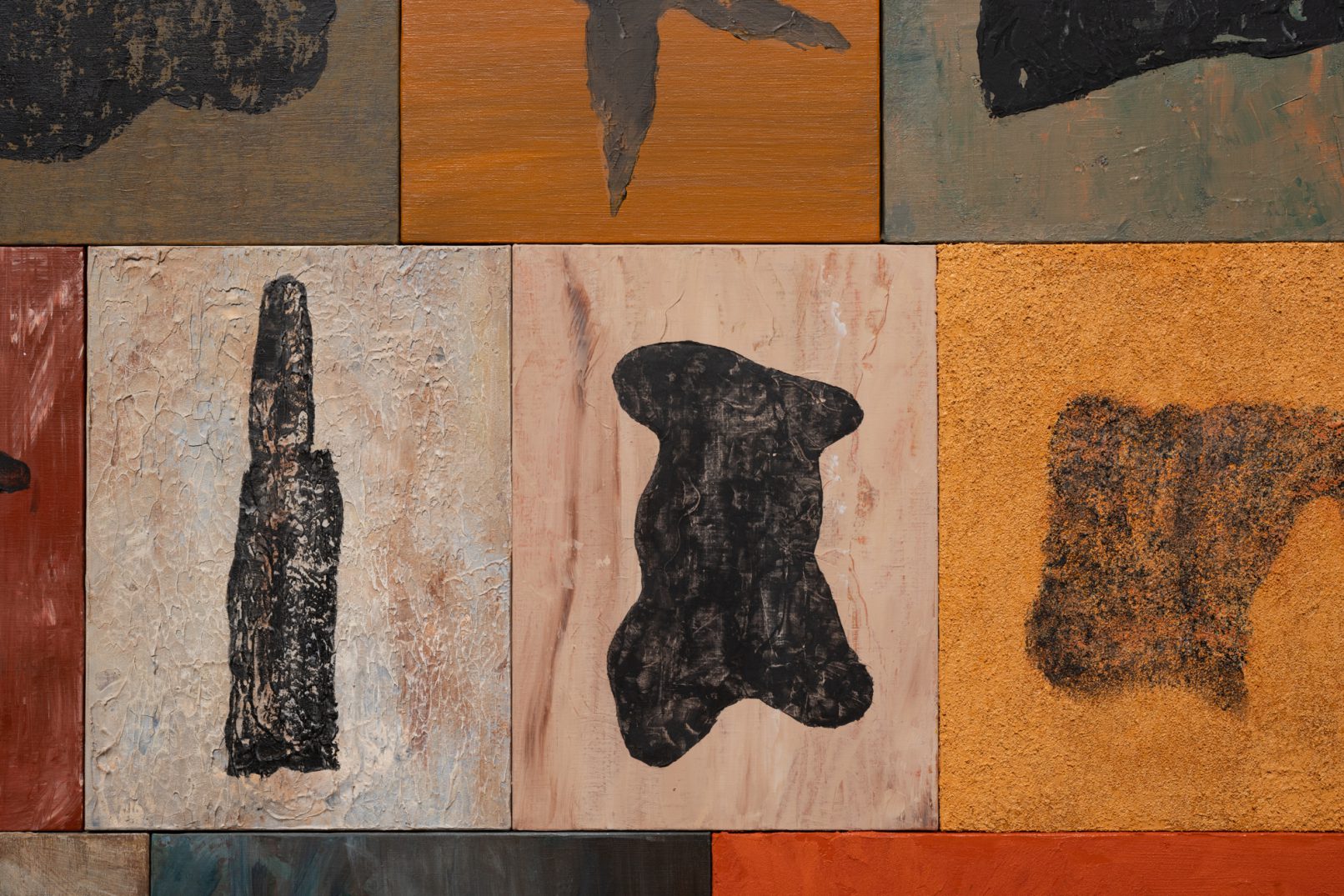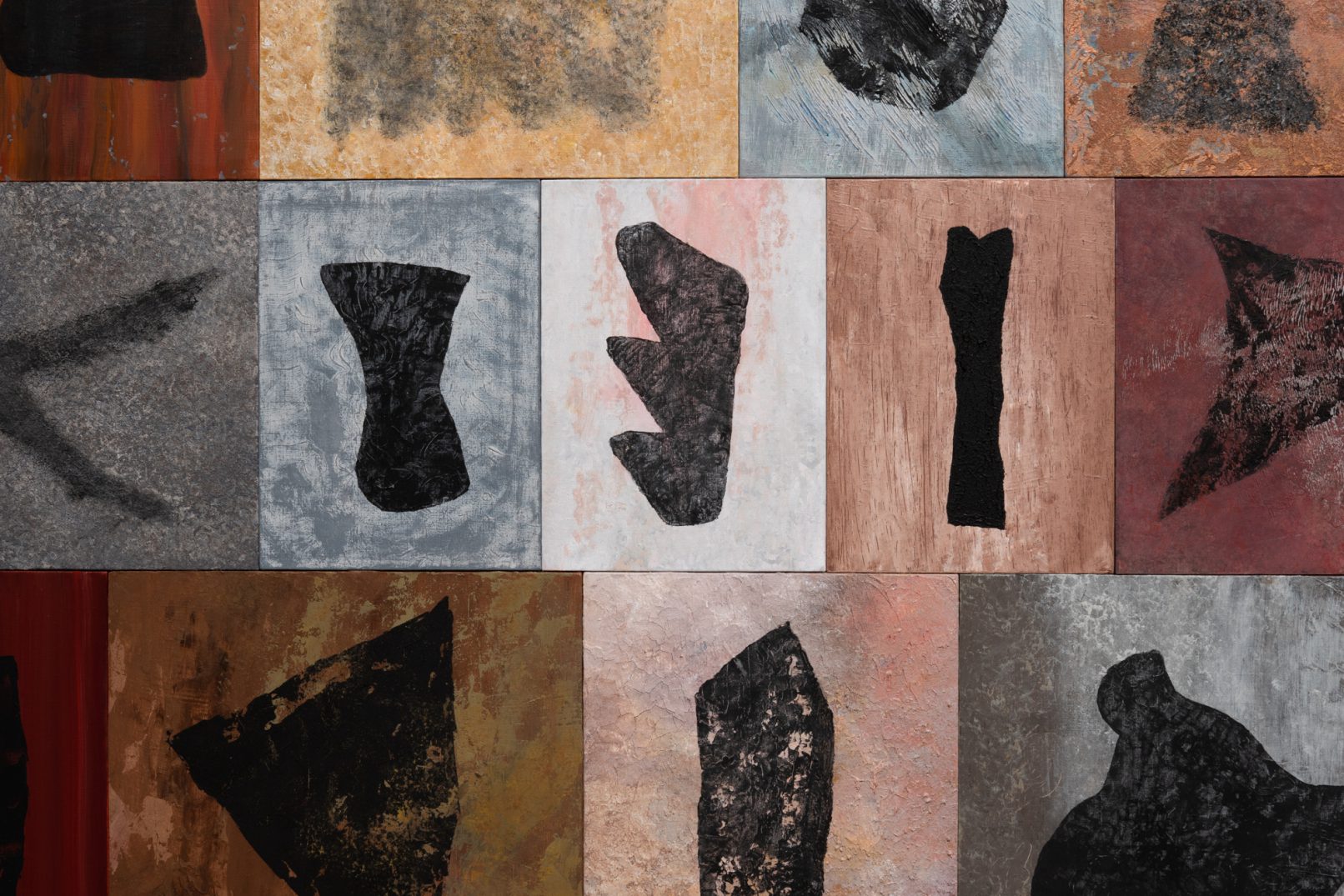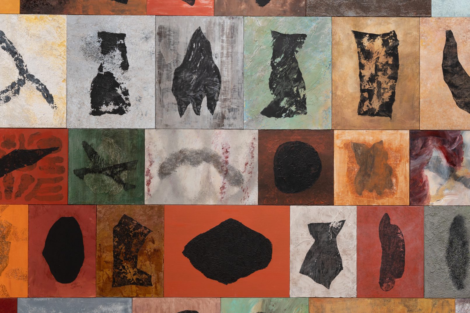 「石の肖像 -埋没する形象02-」は、青森県内で収集した石をモチーフに、約26名の青森県内に住むワークショップ参加者と絵画の下地を協働制作した。