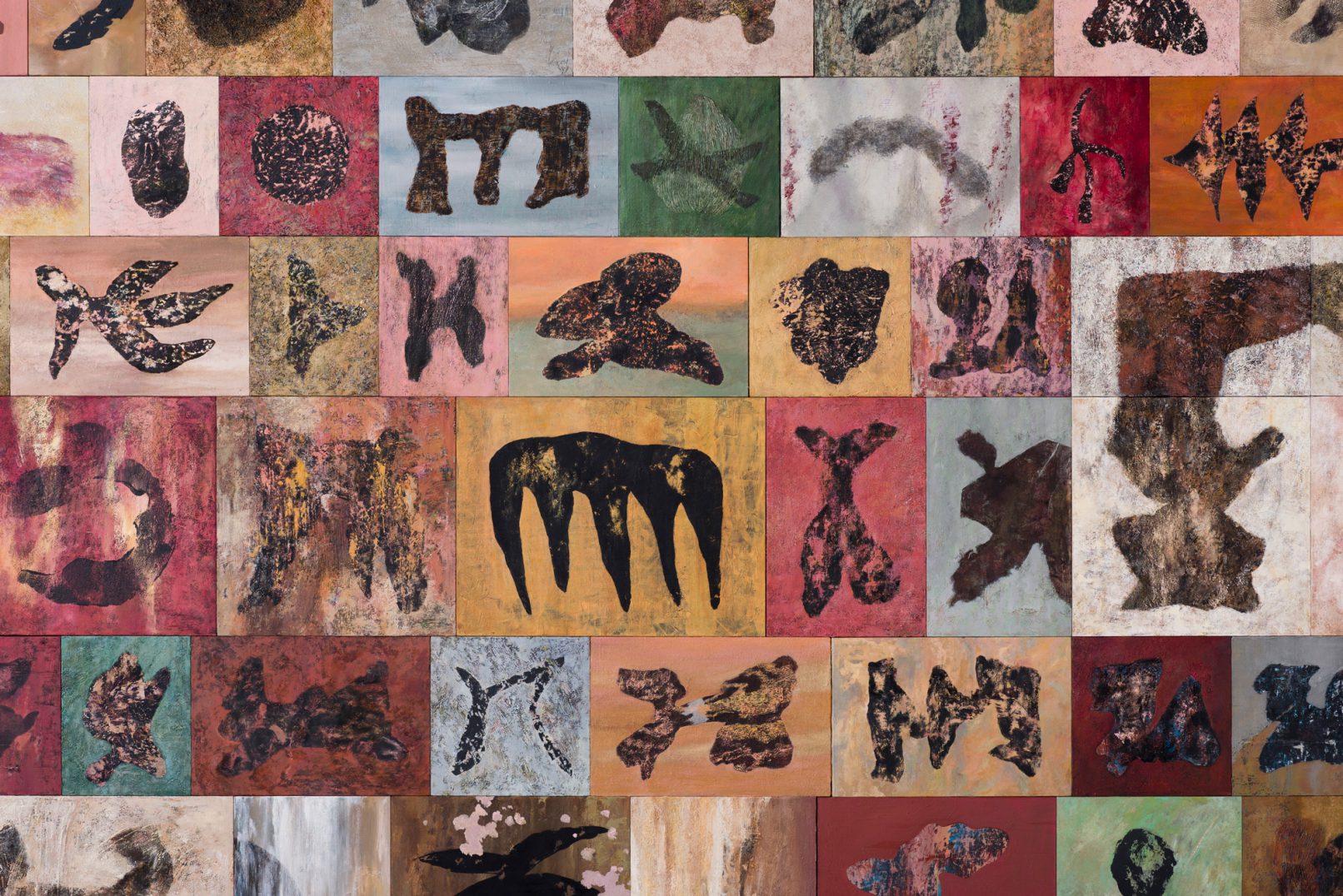絵画の色とりどりの下地は、青森県で収集した錦石がモチーフとなっており、協働制作に参加した方々は、それらの石を見ながらアクリル絵の具やメディウムを用いて、色彩や質感、紋様を作家と同じ道具で描いた。