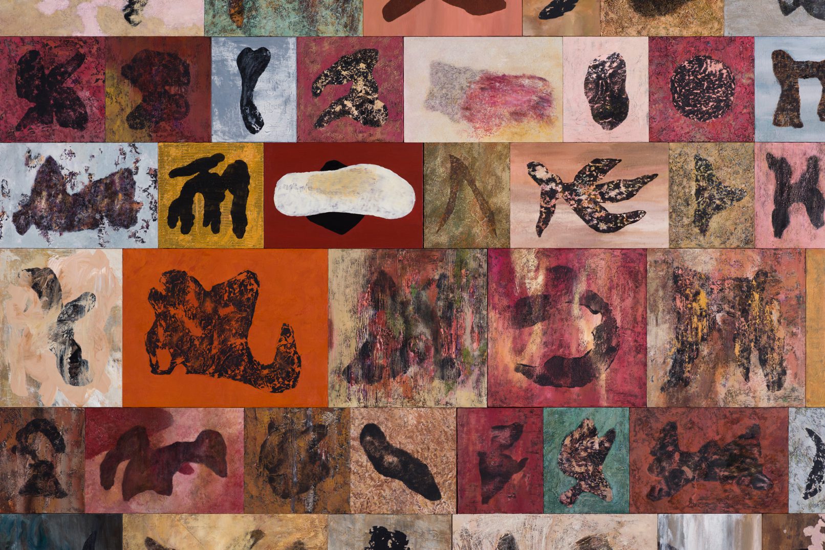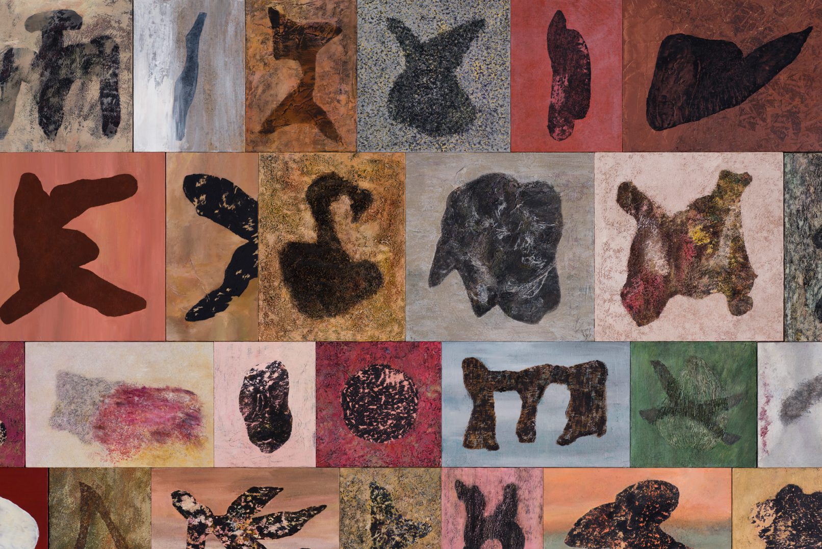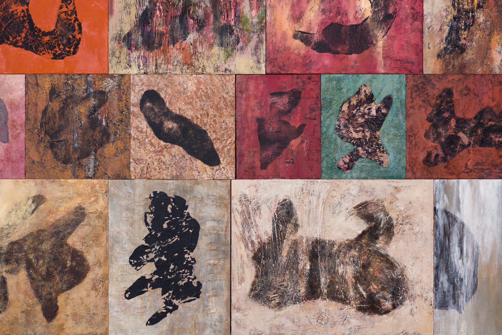 を生み出した。2021 年大阪、時と場所を変え、これらの作品を支持体に同手法による制作をおこなった。バトンとして渡された時間と感覚が積層する、構造物を想起させる絵画が生まれた。環境の中で風化する遺跡の積層構造物