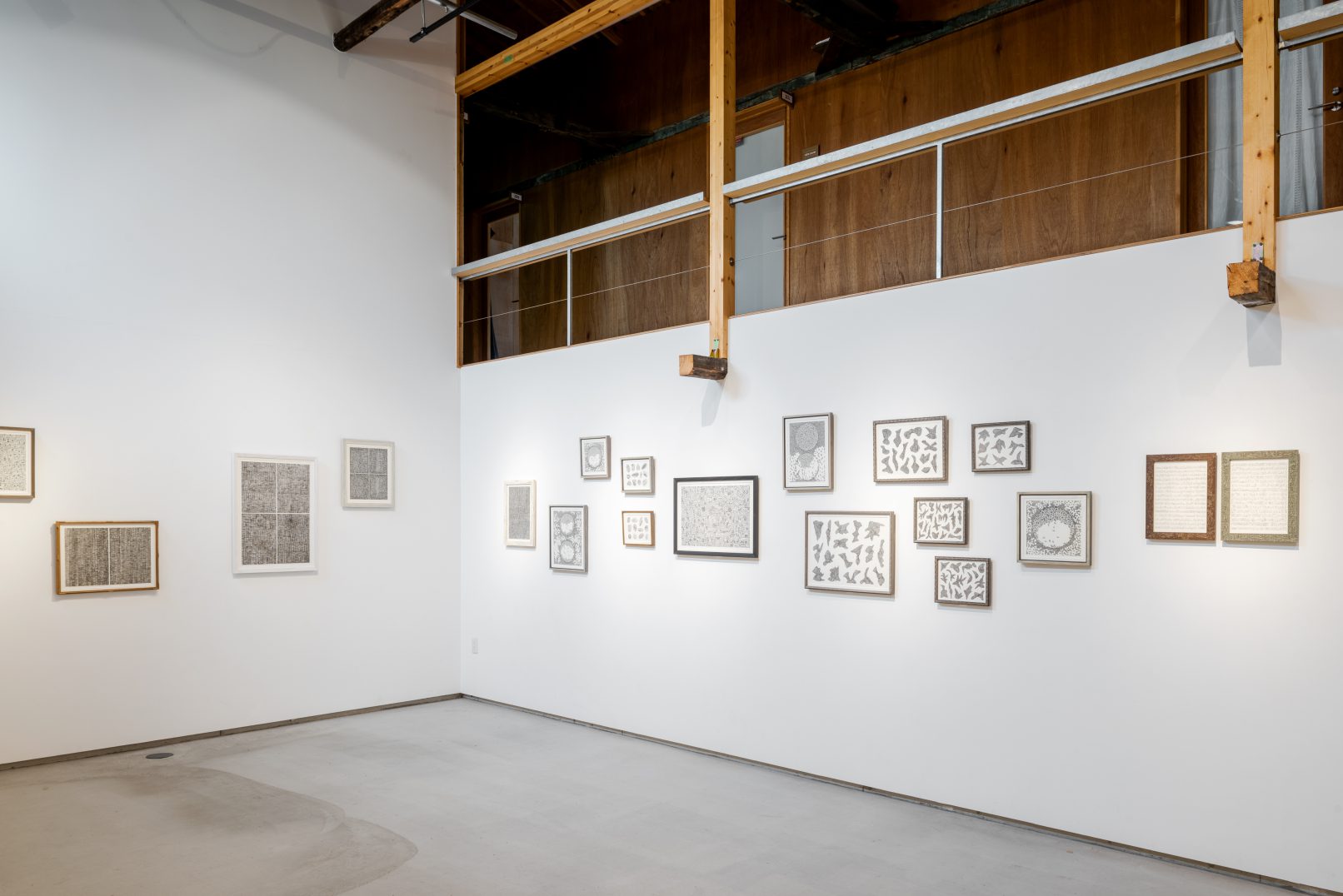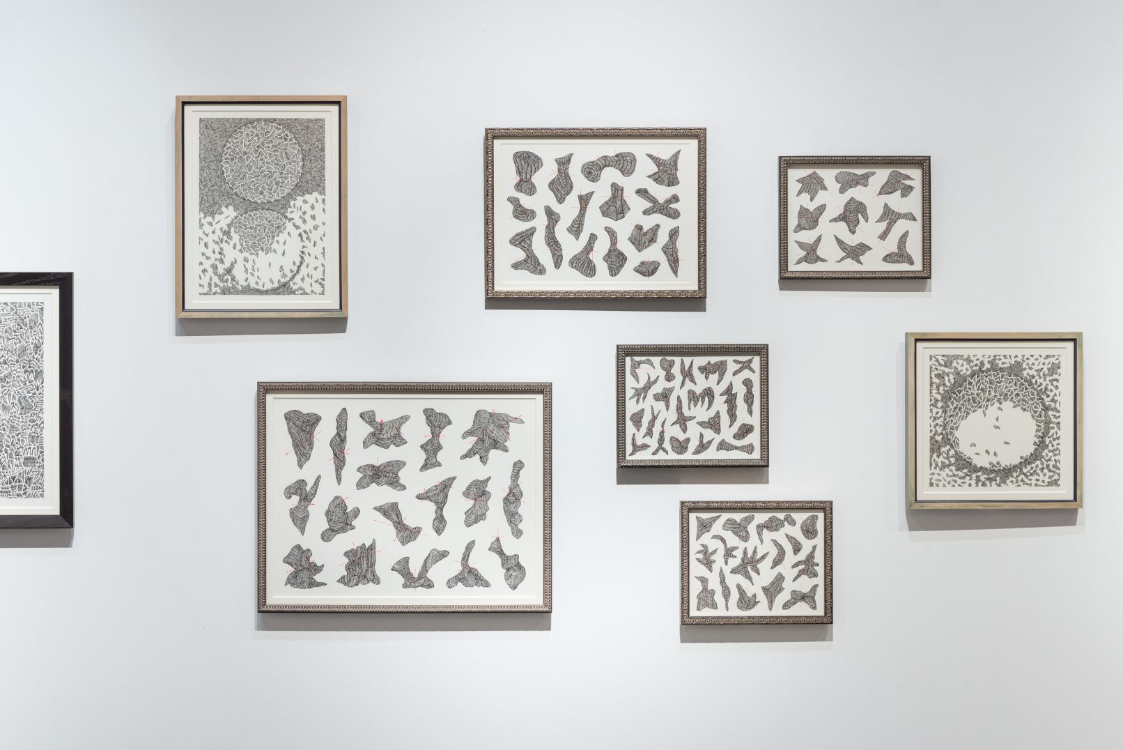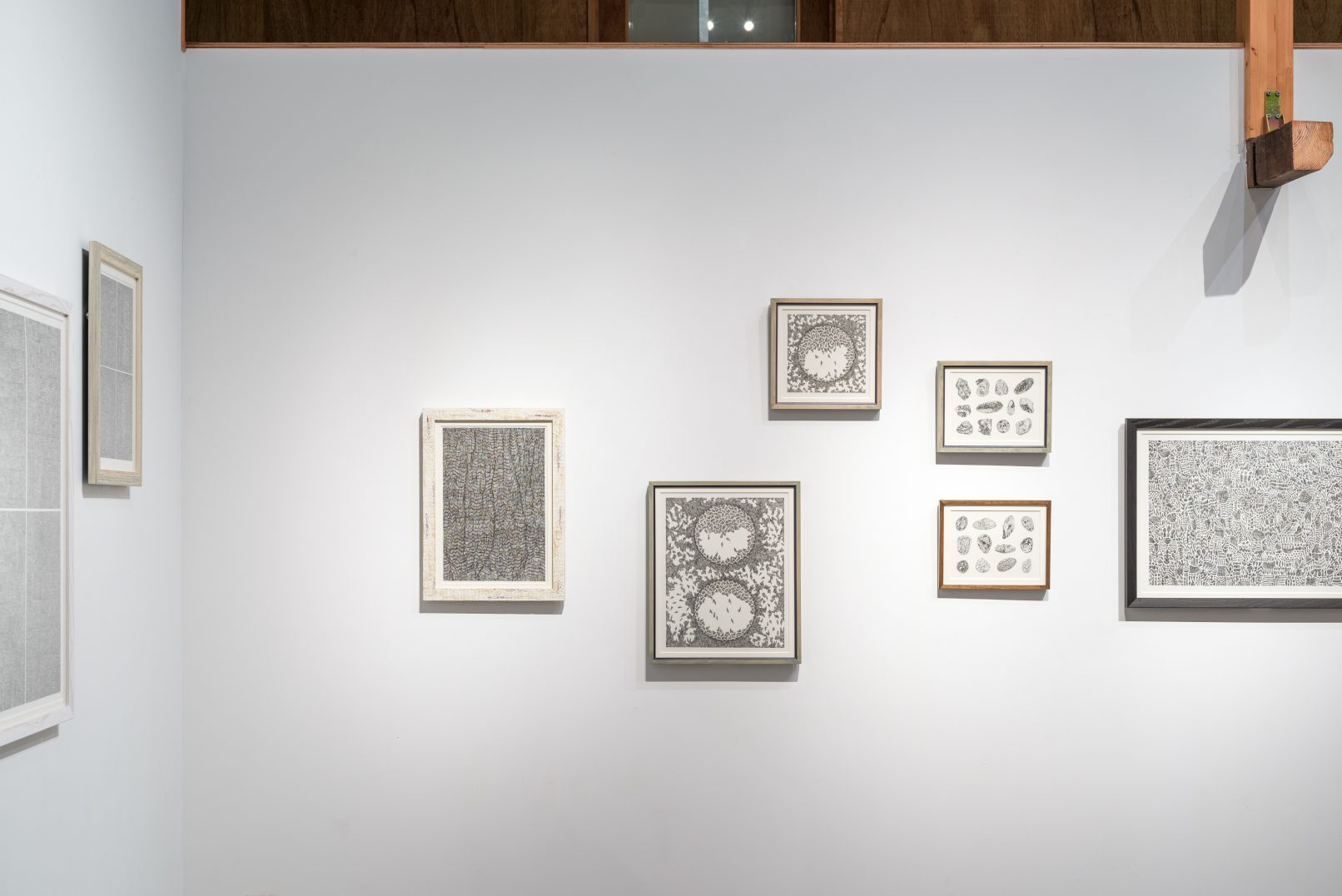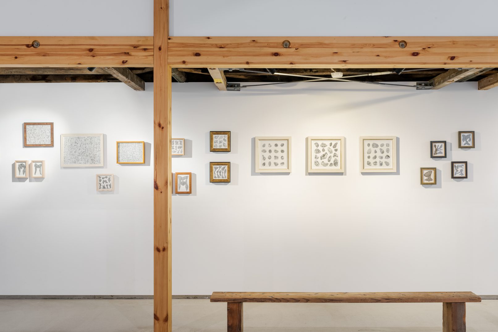 紙を掘るように幾十にも線を積み重ね、ぼんやりと滲み出す形を引き上げる。普段はただ見えていないだけ、目には写らない日々の体験を、脳の中を深く潜り、像を浮かび上がらせて絵に記す。ドローイングは、日々のささやかな生活や四季の移ろいの中で見つけた現象や音、人との関わりの中で体験する名を付け難い情感をパターン化し捉えること。それらの行為は、ここ6年間ほどで習慣化するようになった。