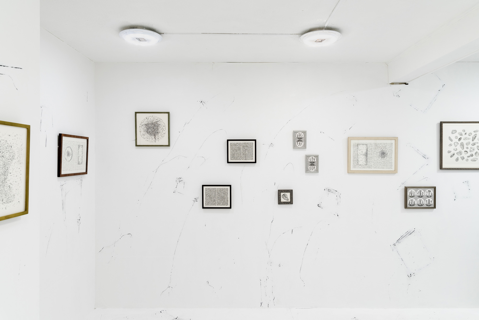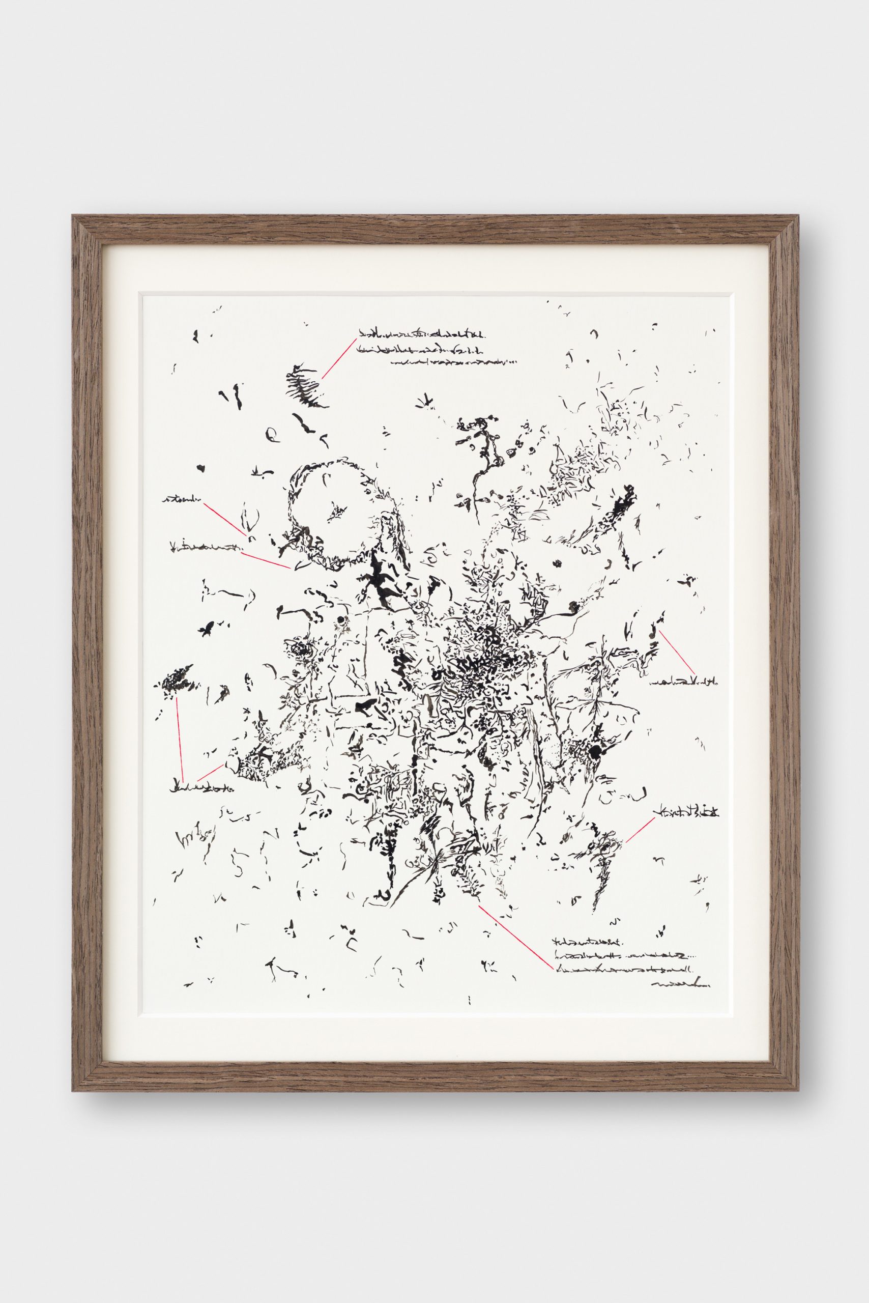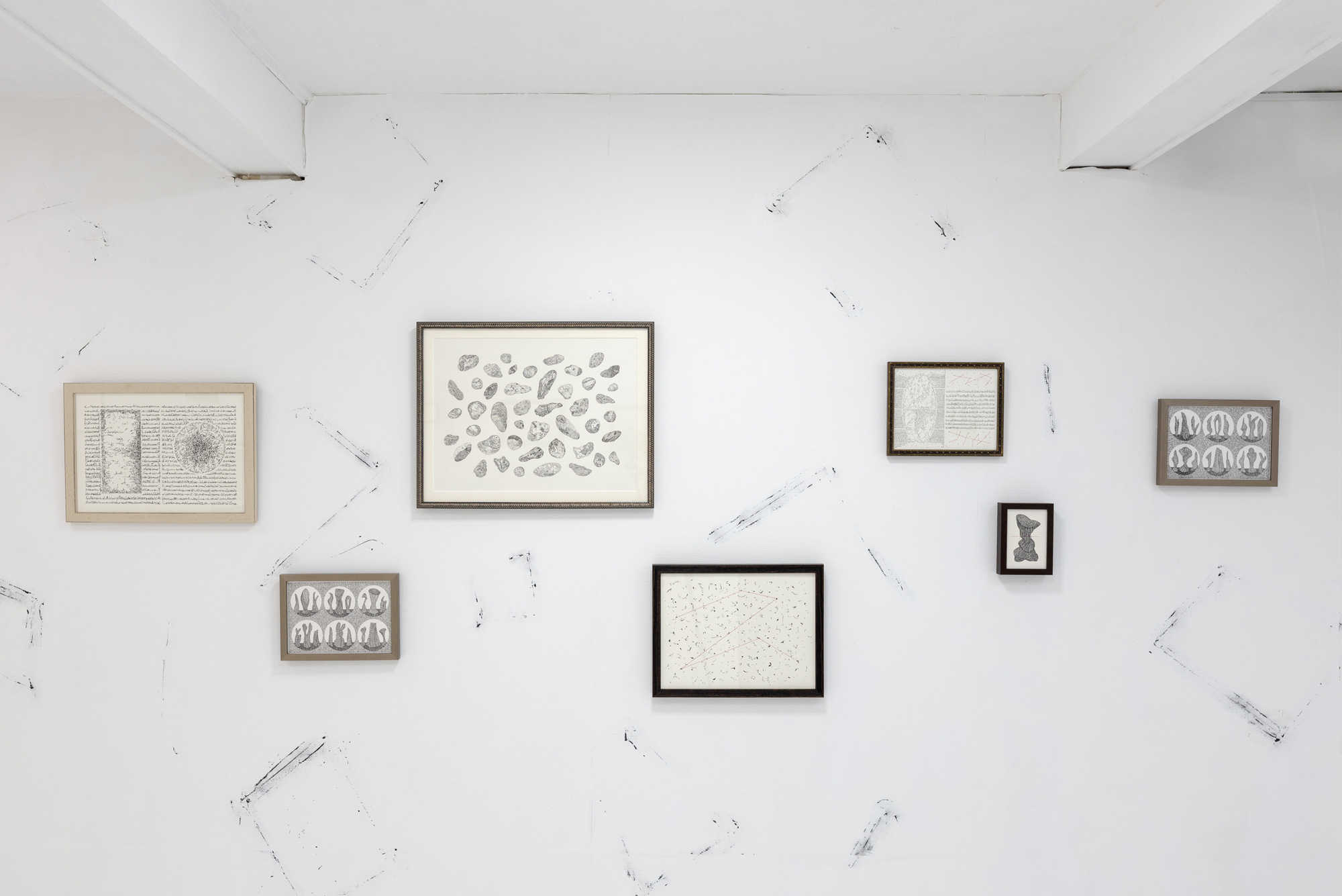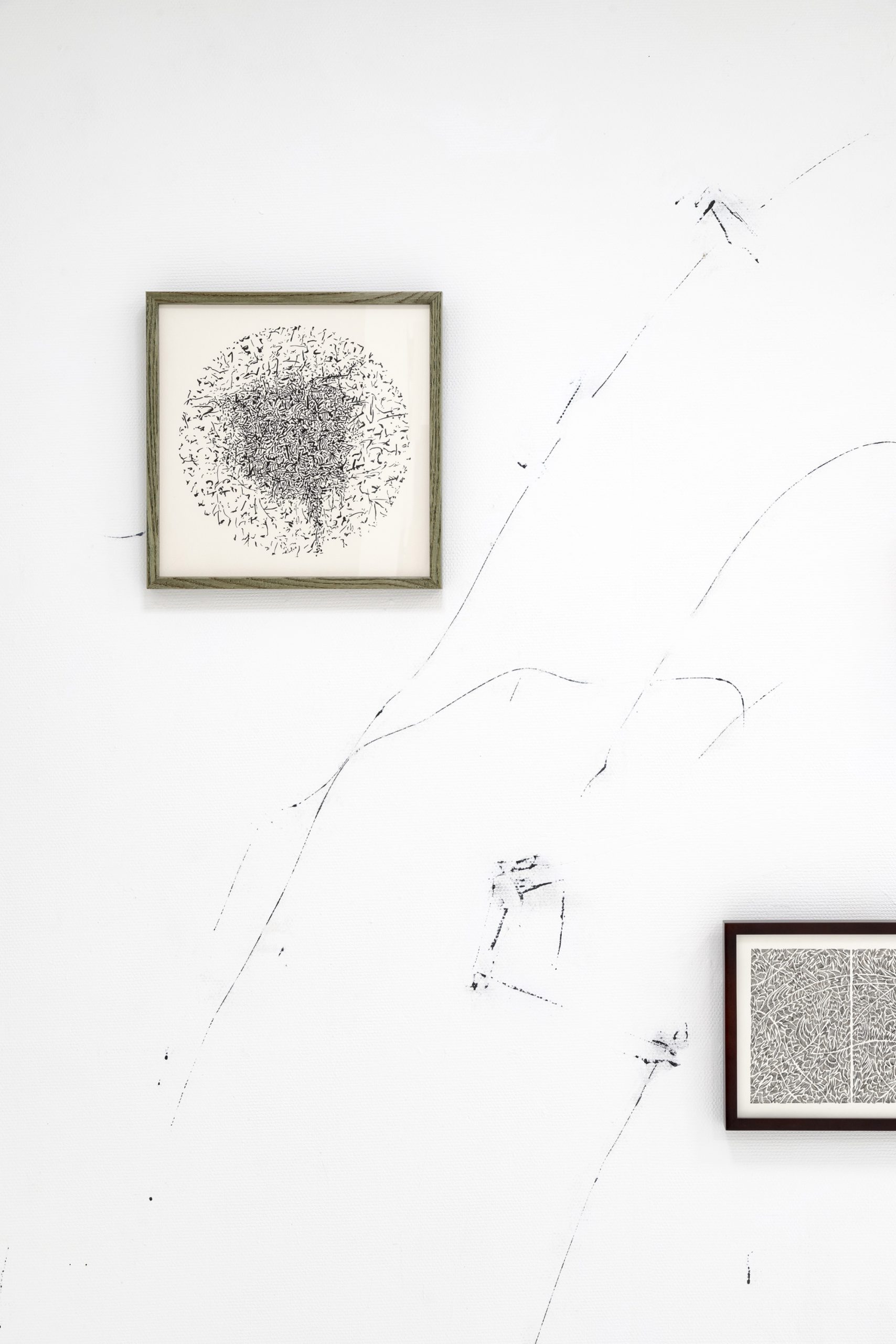 木の根を抜いて眺めたり、チューリップの花びらを解いてみたり、海岸に行って石を拾ったり。日常の隙間で収集した形や色を、いつも同じ画材で記録する。強い風の日の音、どこからか香った匂い、今日会ったあの人のこと…消え忘れていく些細な記憶は、紙の上で踊るような線となり、名のない形となり残ってくれる。日々、暗くぼんやりとした脳中の壁を削るように描くことは、私がまだ知らない言語を生み出す行為でもある。(野原万里絵)