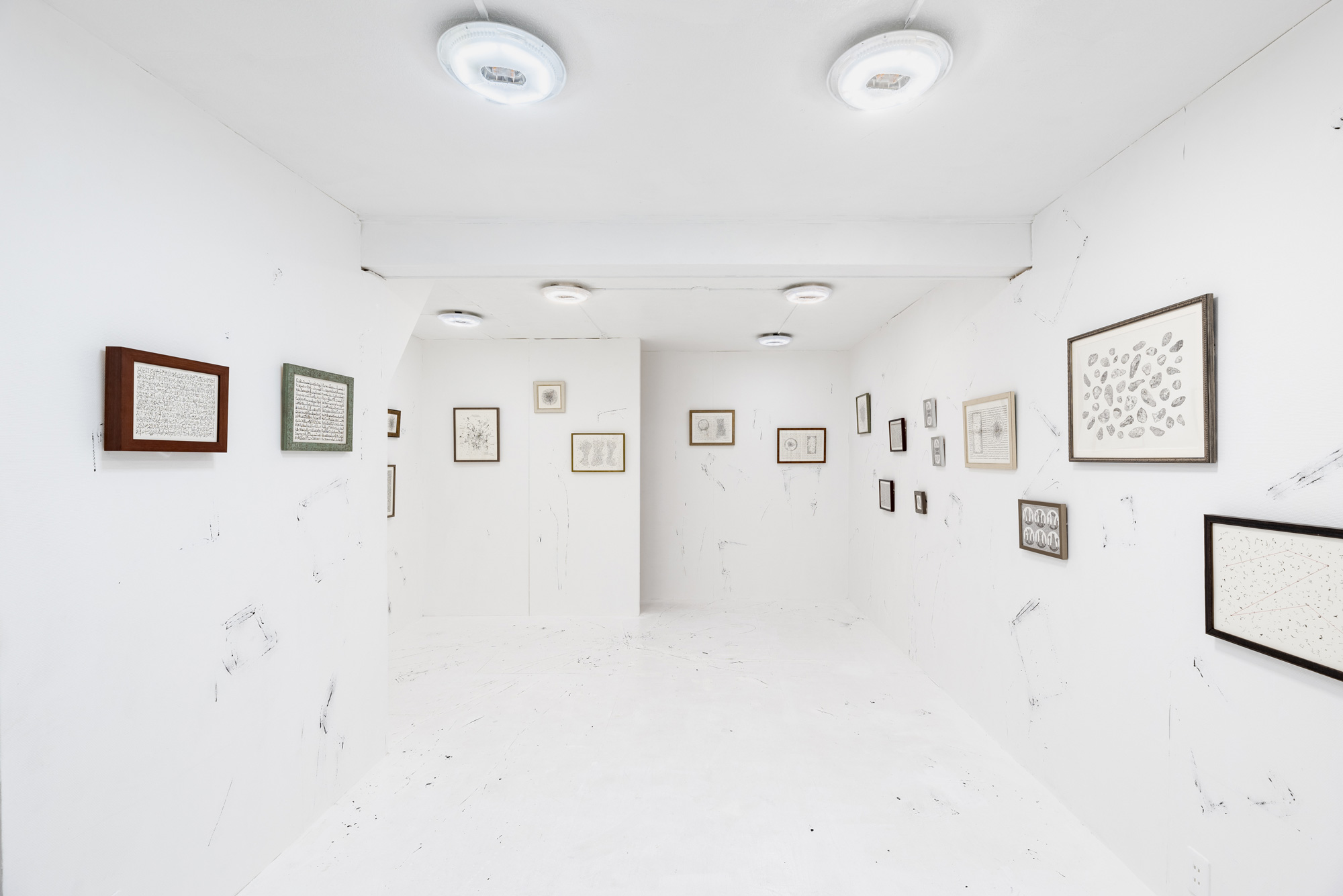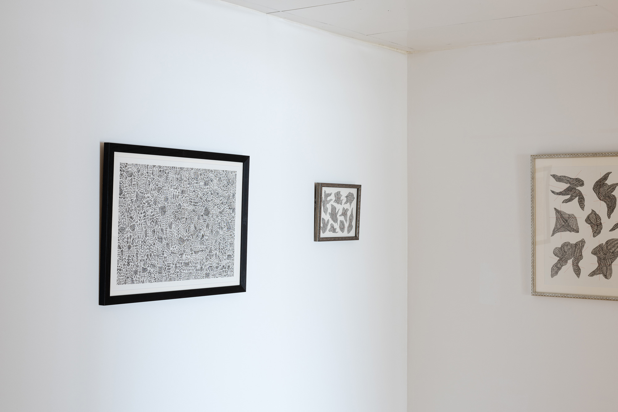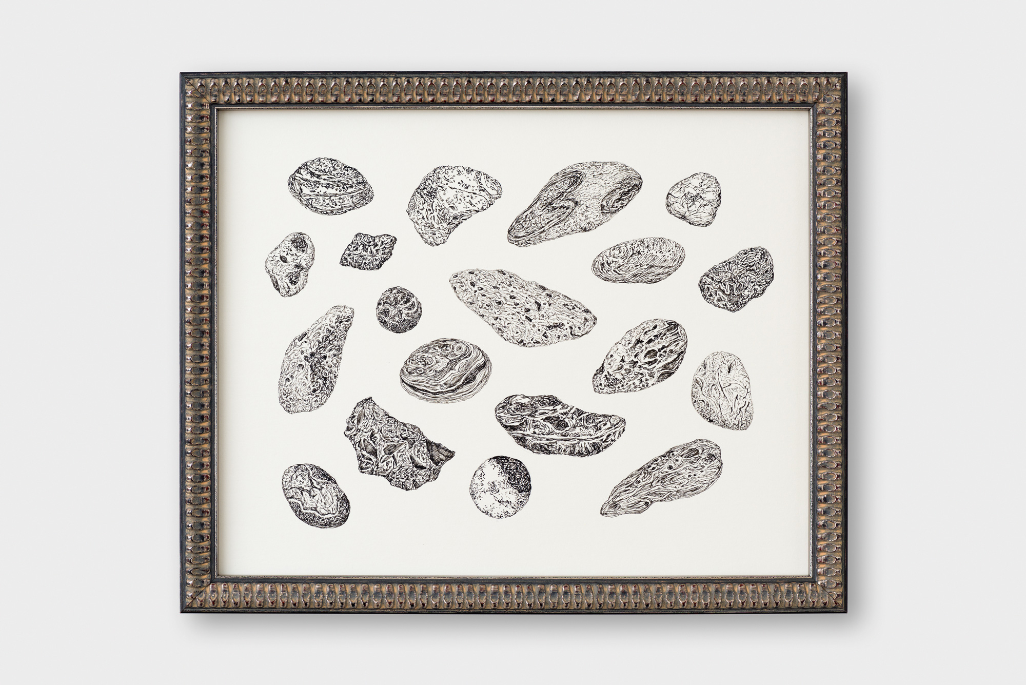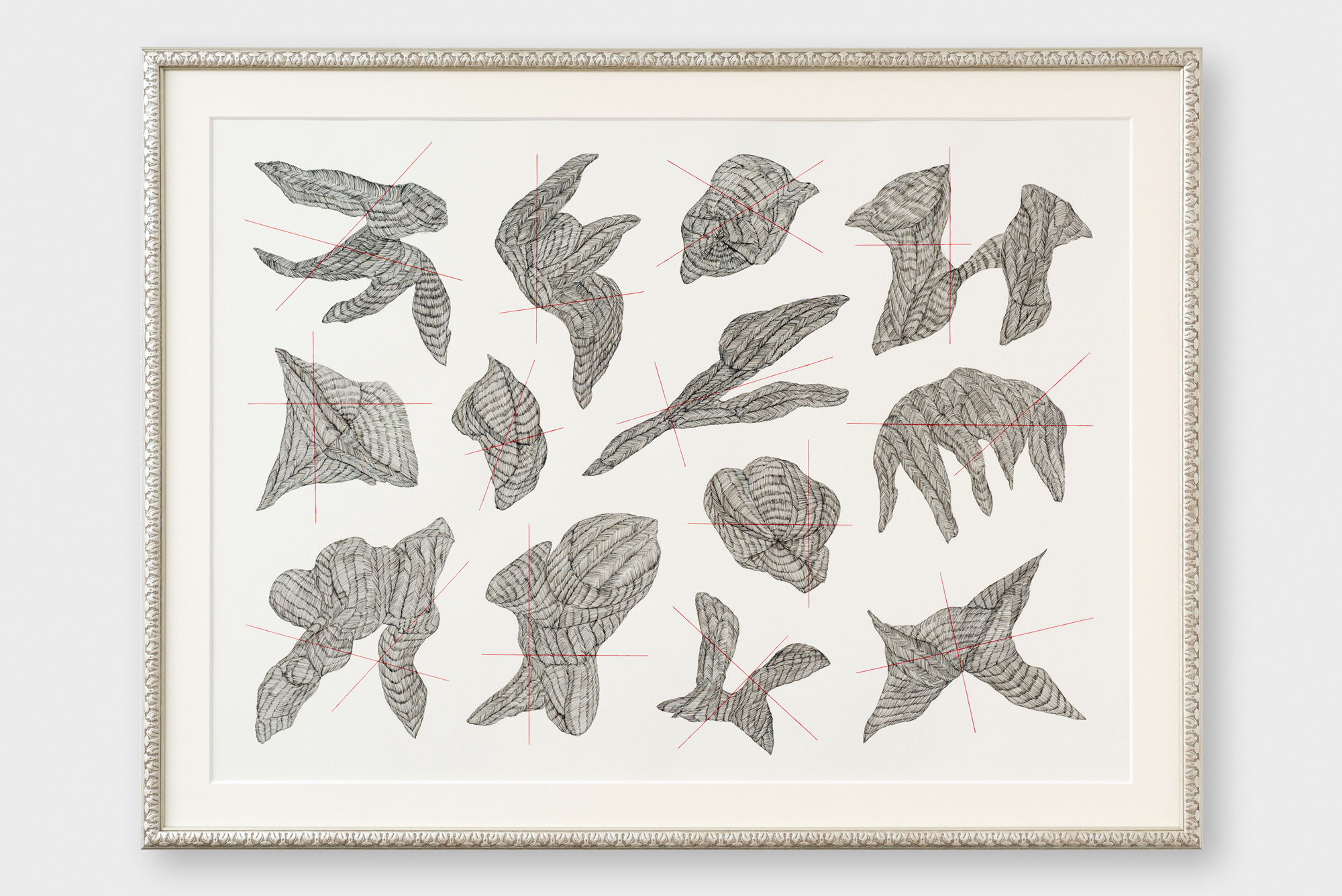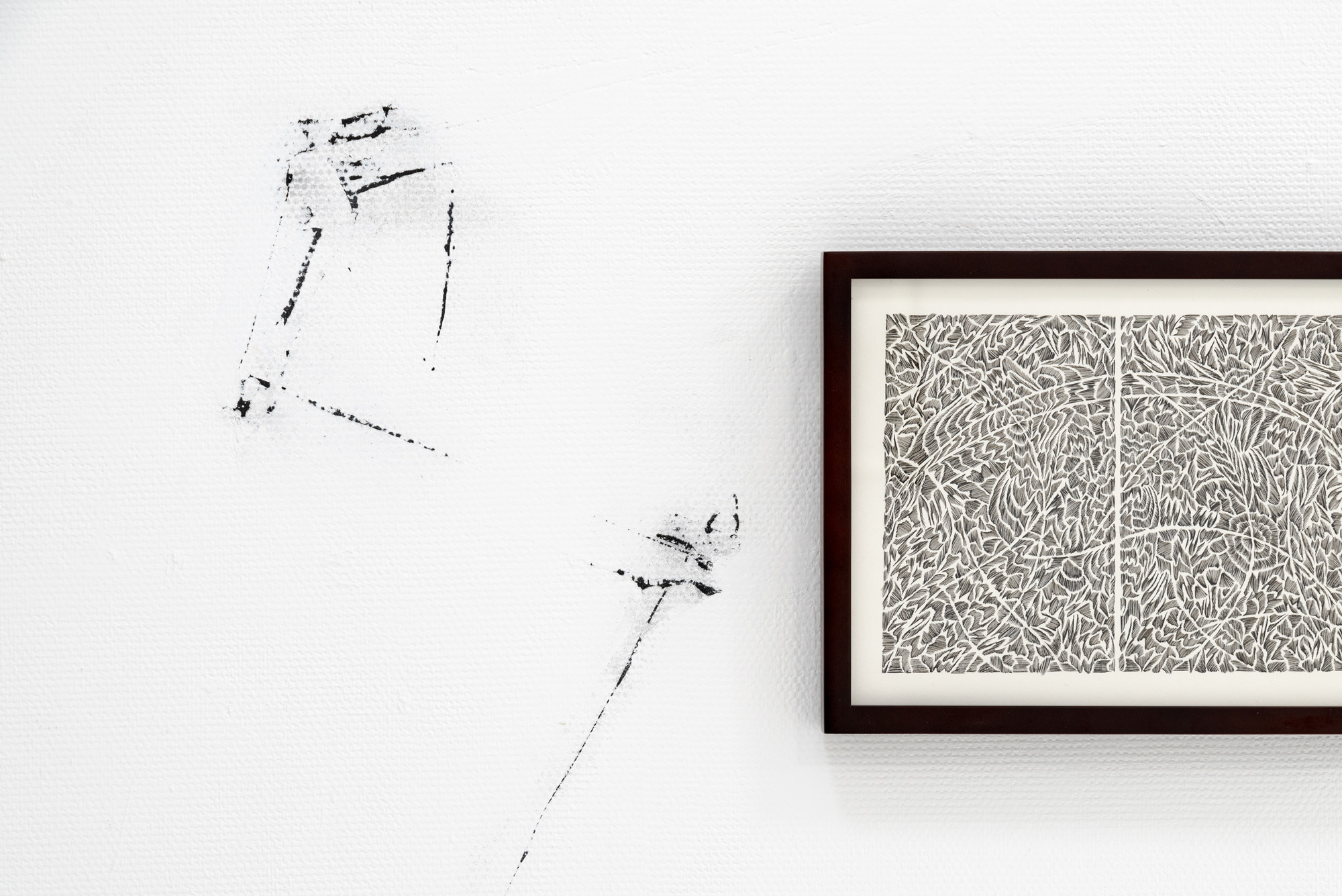 木の根を抜いて眺めたり、チューリップの花びらを解いてみたり、海岸に行って石を拾ったり。日常の隙間で収集した形や色を、いつも同じ画材で記録する。強い風の日の音、どこからか香った匂い、今日会ったあの人のこと…消え忘れていく些細な記憶は、紙の上で踊るような線となり、名のない形となり残ってくれる。日々、暗くぼんやりとした脳中の壁を削るように描くことは、私がまだ知らない言語を生み出す行為でもある。(野原万里絵)