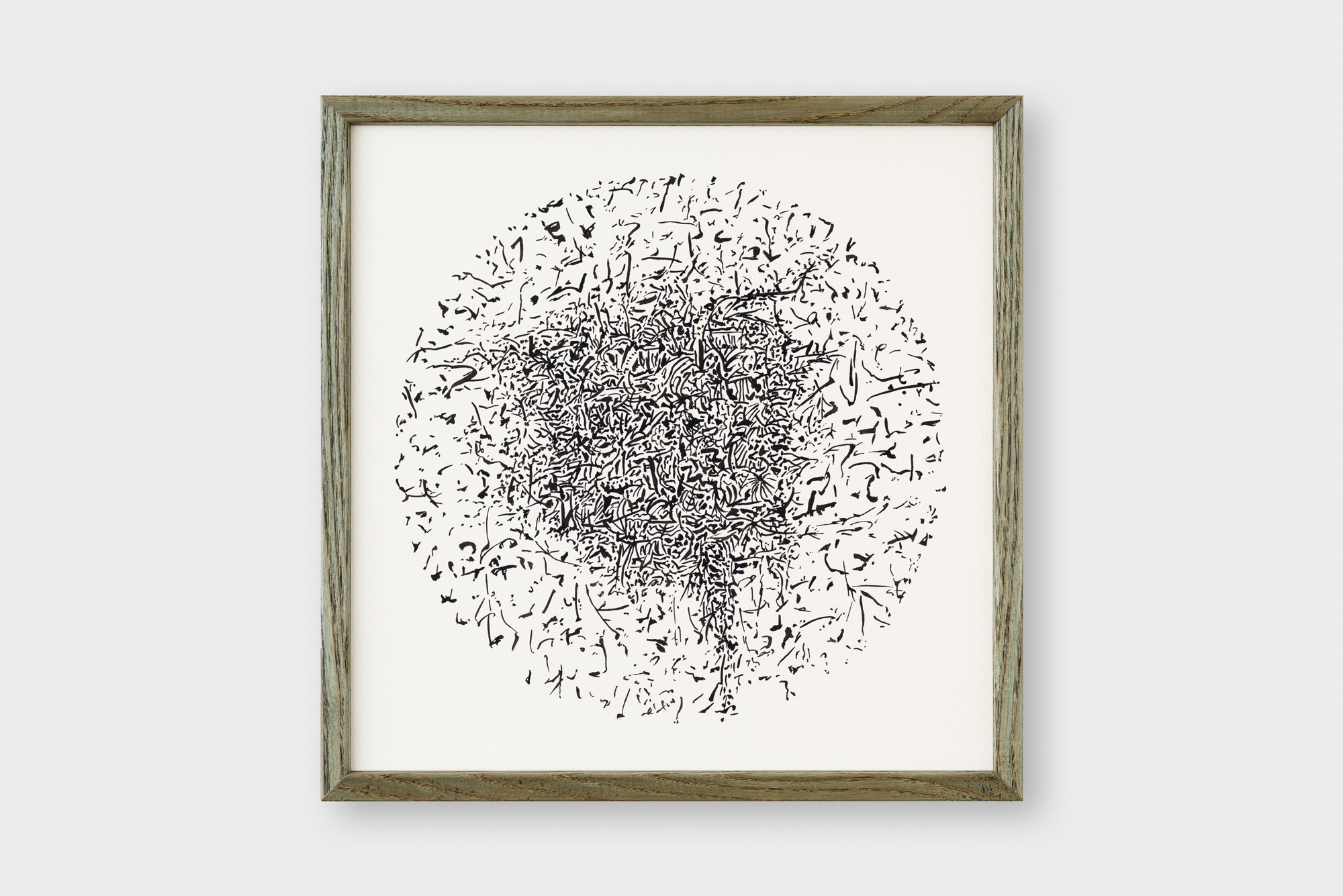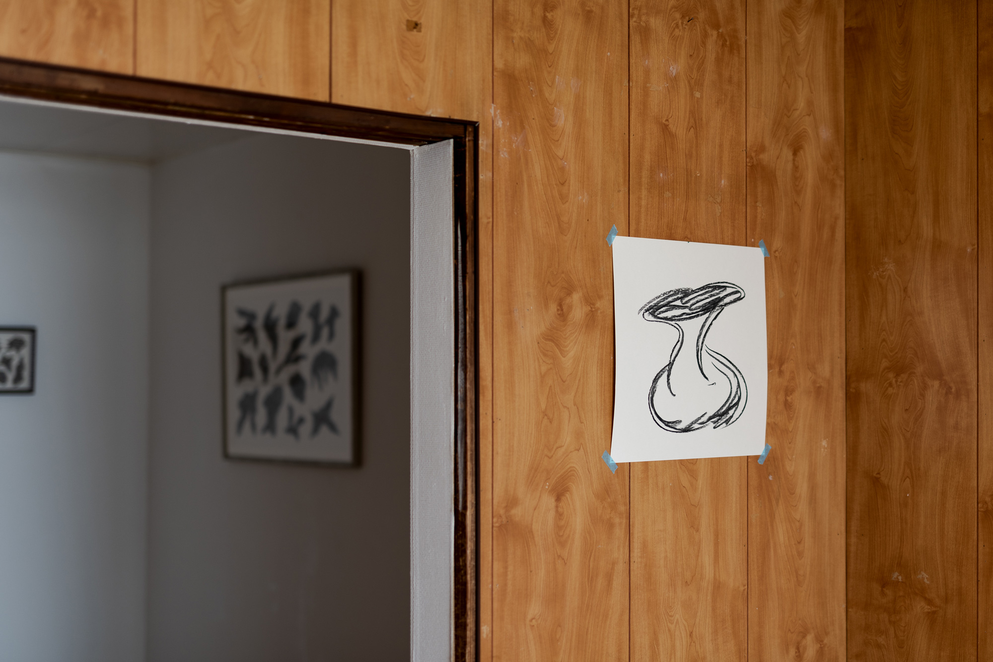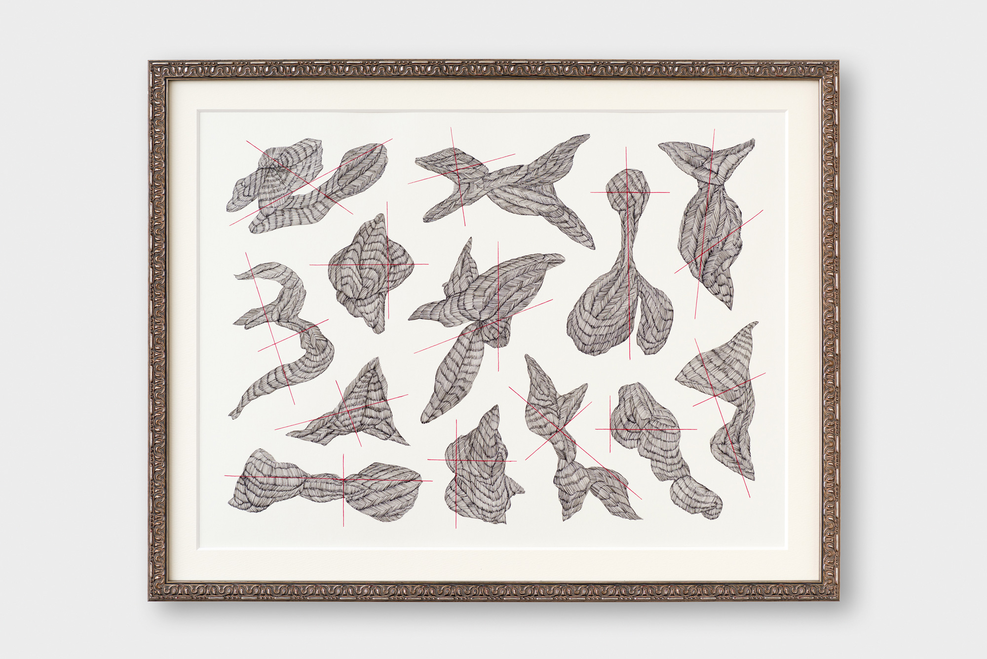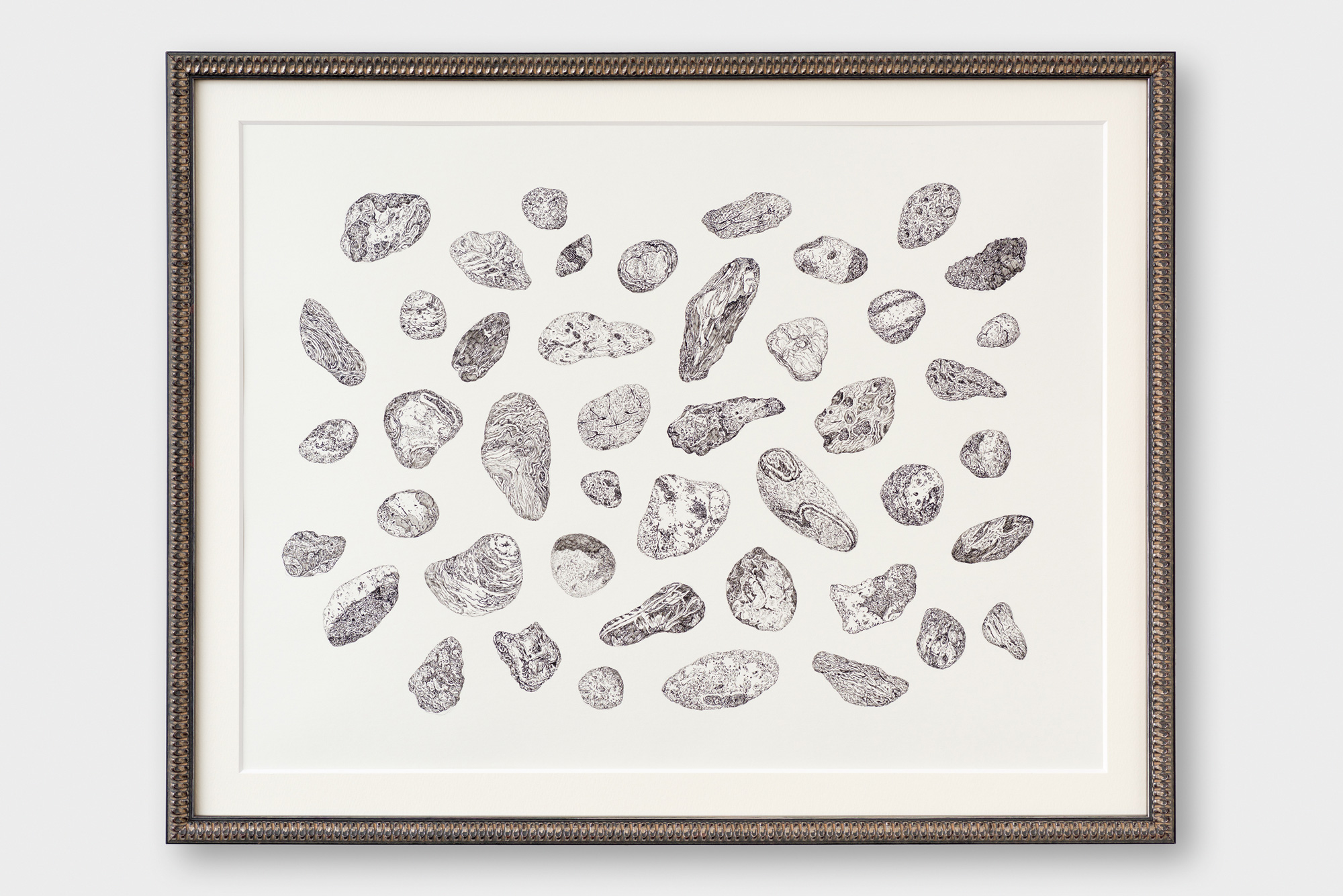 木の根を抜いて眺めたり、チューリップの花びらを解いてみたり、海岸に行って石を拾ったり。日常の隙間で収集した形や色を、いつも同じ画材で記録する。強い風の日の音、どこからか香った匂い、今日会ったあの人のこと…消え忘れていく些細な記憶は、紙の上で踊るような線となり、名のない形となり残ってくれる。日々、暗くぼんやりとした脳中の壁を削るように描くことは、私がまだ知らない言語を生み出す行為でもある。(野原万里絵)